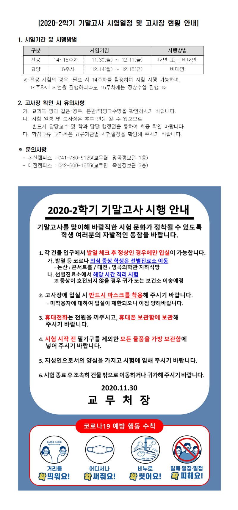 ■ 12/1(화)까지 변경된 기말고사 일정 및 고사장을 안내드립니다. - 변경된 일정은 노란색으로 표시되어 있습니다. - 문의 : 교무팀(논산: 041-730-5125, 대전: 042-600-1655) 단과대학 행정실 또는 각 학과 사무실