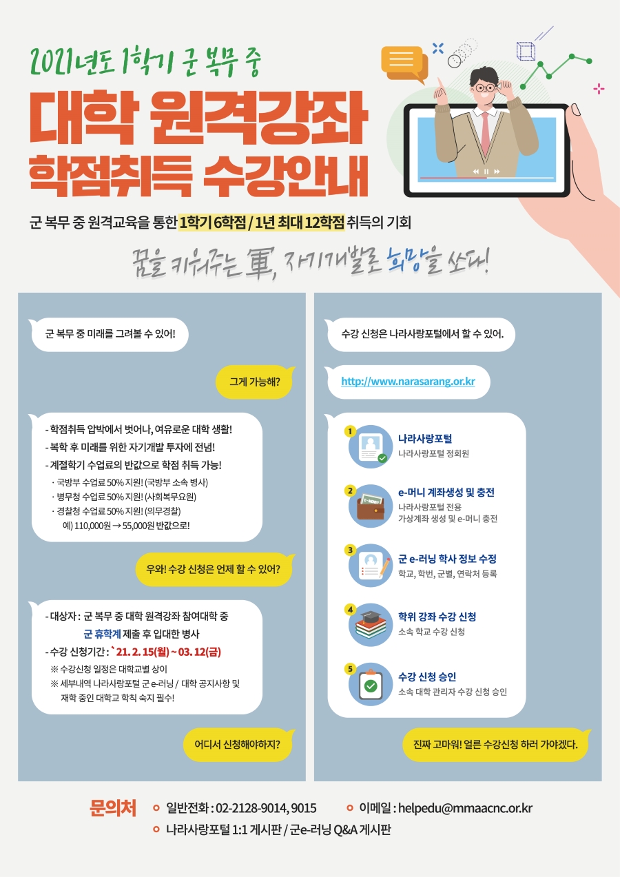 | 제목 | 2021학년도 1학기 군 복무 중 대학 원격강좌 학점취득 수강안내(군e러닝) | ||||