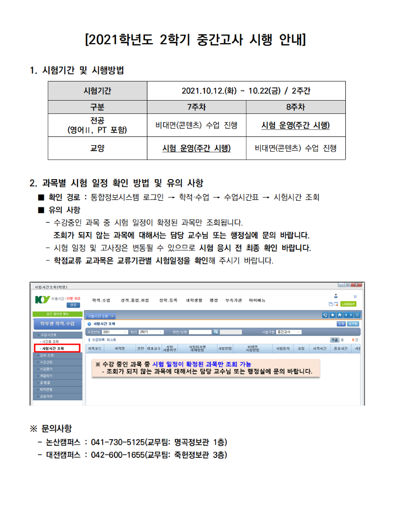| 제목 | 2021학년도 2학기 중간고사 시행 안내 | ||||