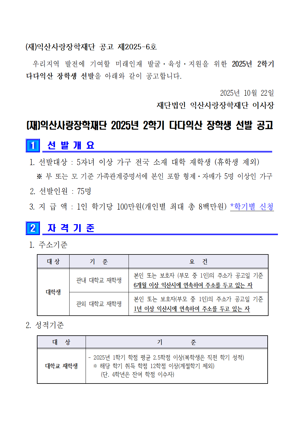 | 제목 | [익산사랑장학재단] 2025년 2학기 다다익산 장학생 선발 안내 | ||||