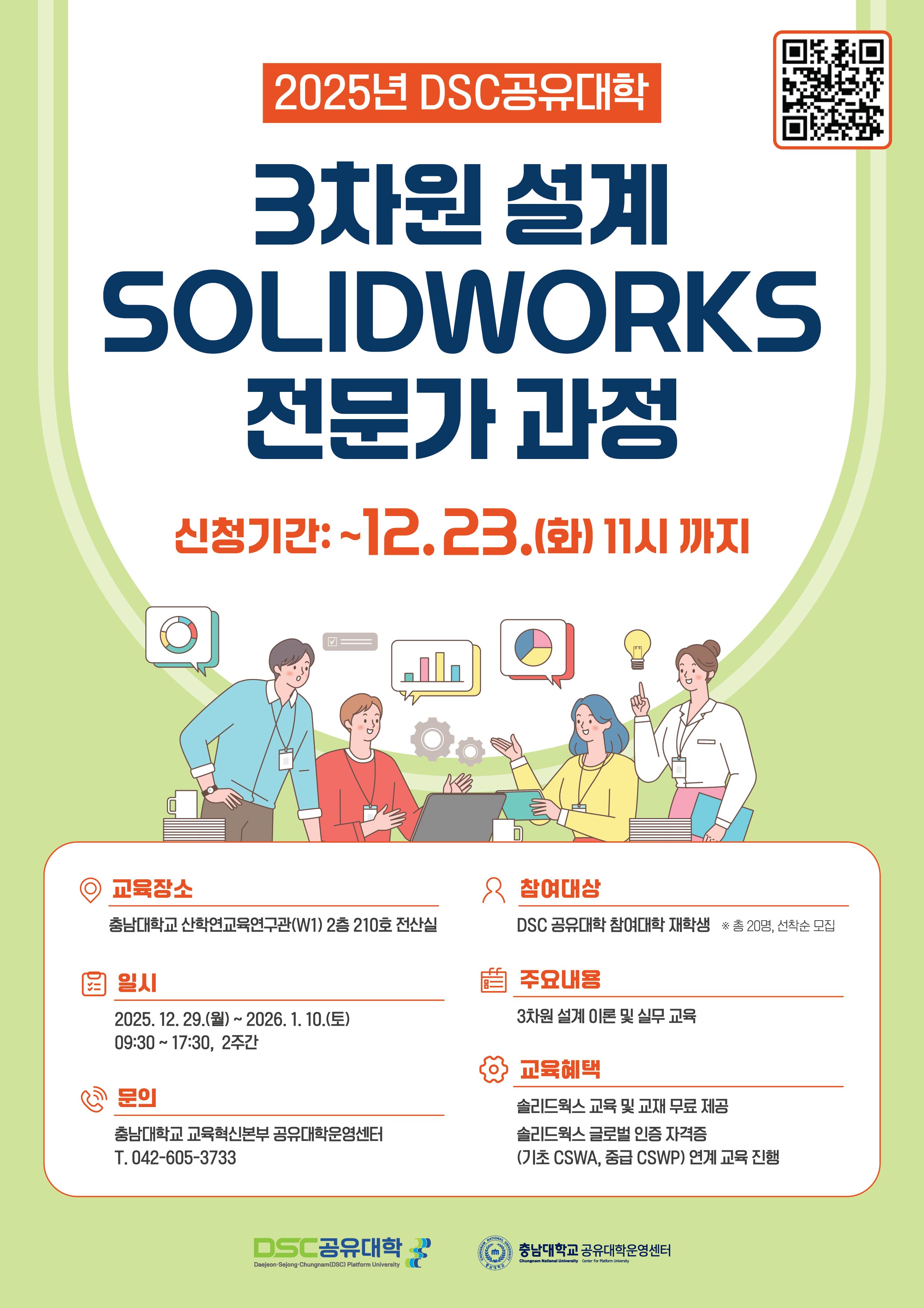 | 제목 | 2025년 DSC공유대학 3차원 설계 SOLIDWORKS 전문가 과정 신청 안내(QR 신청) | ||||