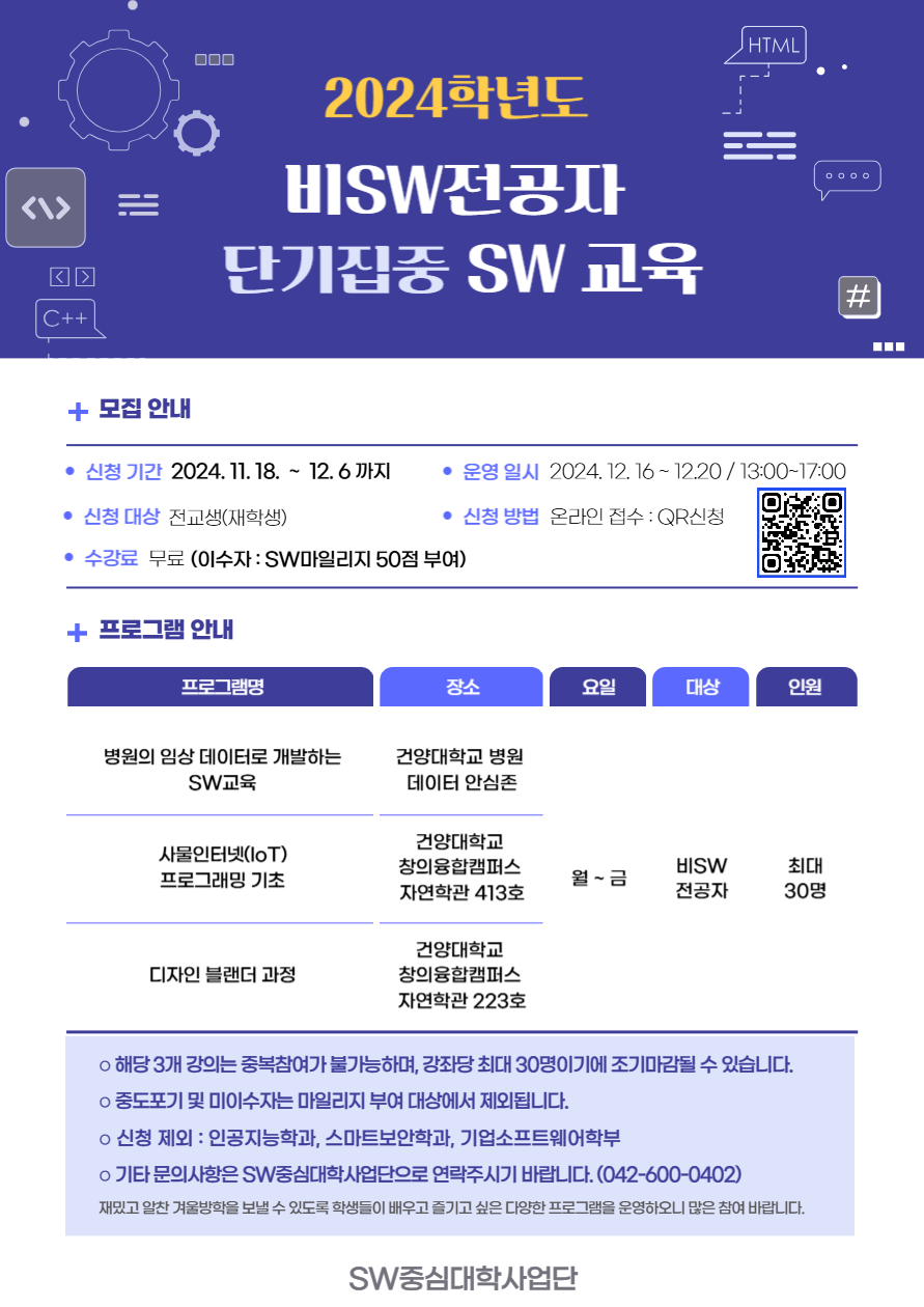 | 제목 | 2024학년도 비SW전공자 단기집중 SW 교육 모집 안내 | ||||
